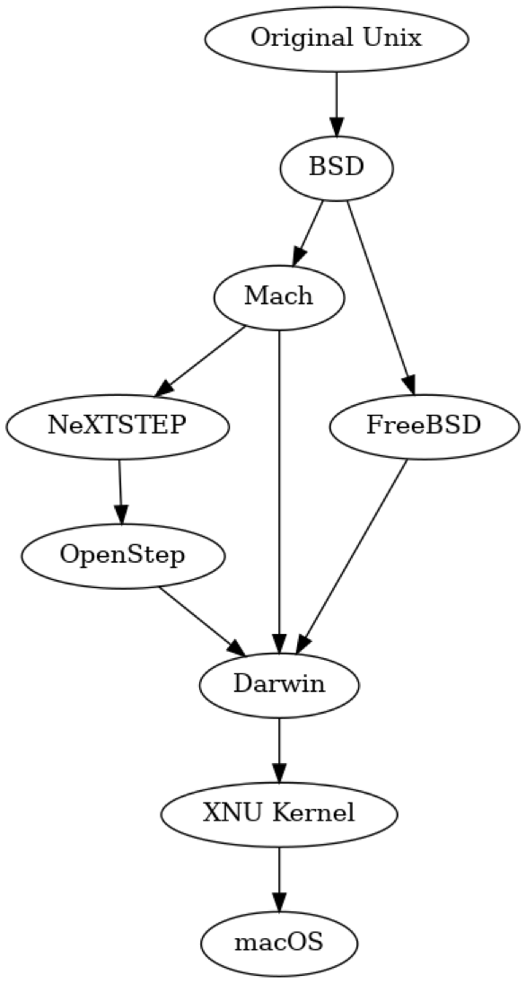 这些操作系统的真正基石在于苹果较早期的操作系统技术与 NeXTSTEP 的结合,而 NeXTSTEP 本身是 Mach 和 BSD 的混合体——早于 FreeBSD。尽管多年来,FreeBSD 的一些用户空间元素被整合进上述操作系统,但苹果的内核(XNU)并不直接来源于 FreeBSD。然而,它们确实共享一脉共同的 BSD 传统。