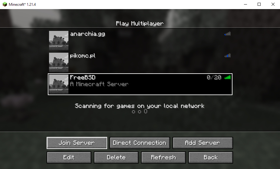 稍等片刻,我们的基于 FreeBSD 的 Minecraft 服务器将出现在列表中。