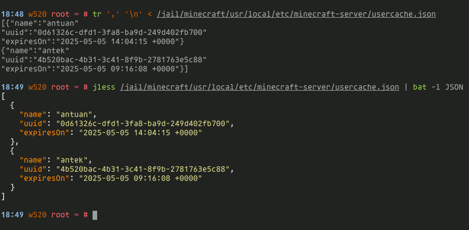 当有人连接到我们的服务器时,他的 名字 和 uuid 会被添加到 /usr/local/etc/minecraft-server/usercache.json 文件中,如下所示。