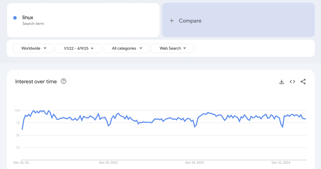 在相同时间段内,“Linux”的搜索量显示出的是平稳趋势。虽然绝对数字可能大不一样,但趋势很明显:Linux 是一条平线,而 FreeBSD 呈缓慢上升趋势。