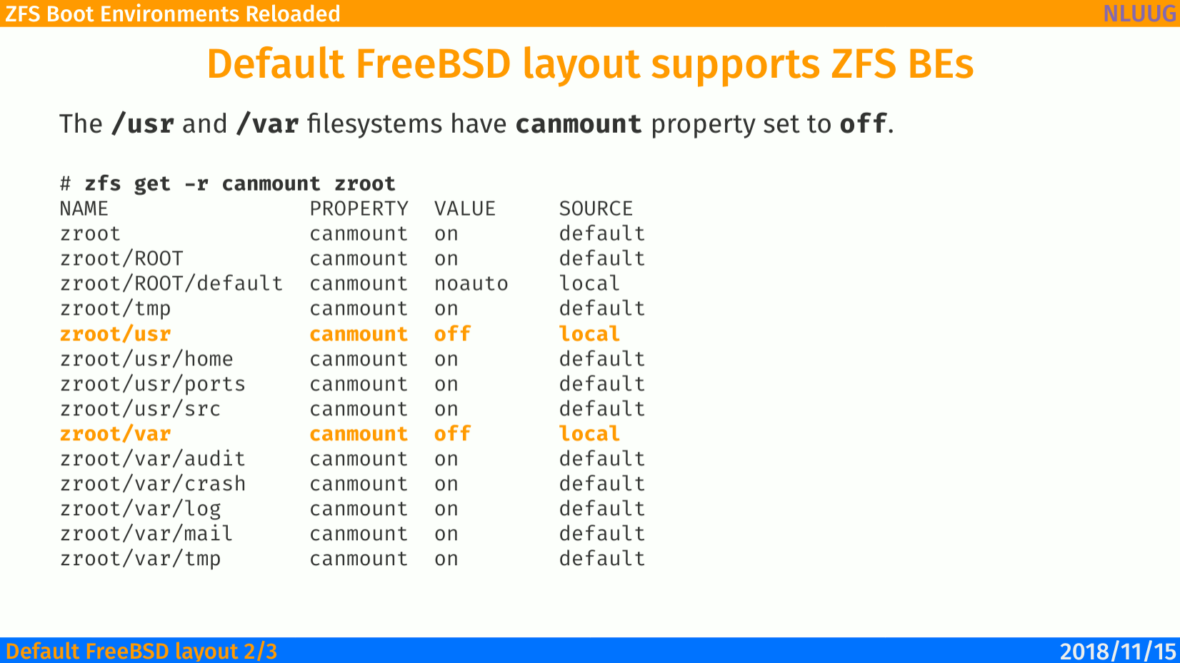 关键点在于,zroot/usr 和 zroot/var 这两个 ZFS 数据集都具有 canmount=off 这个 ZFS 属性。这意味着 /usr 文件系统 并不存放在 zroot/usr 这个 ZFS 数据集中……它是存放在 zroot/ROOT/default 这个 ZFS 启动环境里的。