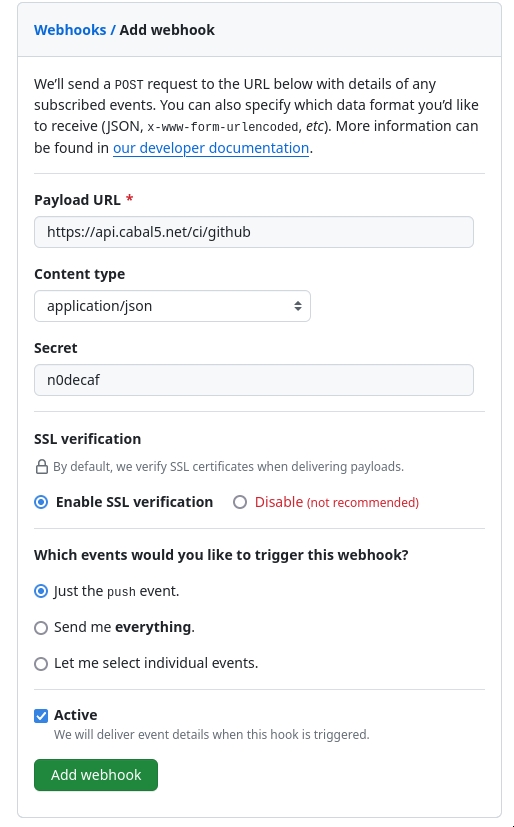在你的代码托管平台(如 GitHub)创建一个新的 JSON 格式 webhook,并使用共享的 HMAC 密钥,在每次推送到仓库时触发它。