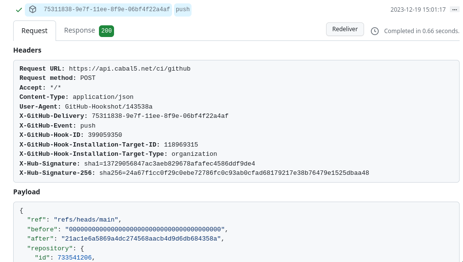 在 GitHub 上创建 webhook 后,你应该能够确认接收到了成功的事件。在你下次推送代码时,可以查看 GitHub 网站,查看 GitHub 发送的请求和 daemon 返回的响应。