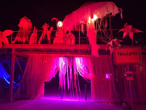 砖厂有一些建筑和中央基础设施被改装成令人印象深刻的照明装置。每晚,老工厂的烟囱上都会用激光写上信息。中央的“小山”(工厂里的一个旧的观测和装载站)装满了十几台巨大的烟雾机,可以用一堵烟幕覆盖 Marktplatz 周围的区域。这堵烟幕然后被激光和聚光灯照亮。穿过这个带有灯光和烟雾的地方,让你穿过一堵厚厚的墙,能见度很低,进入一个烟雾和灯光共同作用的区域,使世界增加了一层深度。