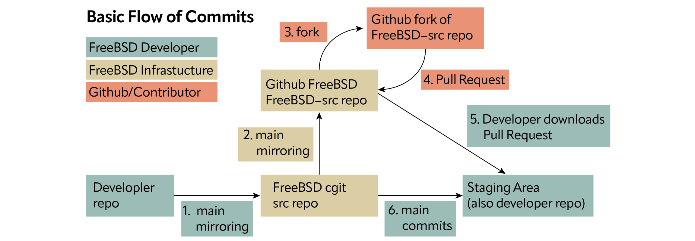 FreeBSD 开发者直接向 FreeBSD 存储库推送提交,该存储库托管在 <FreeBSD.org> 集群。