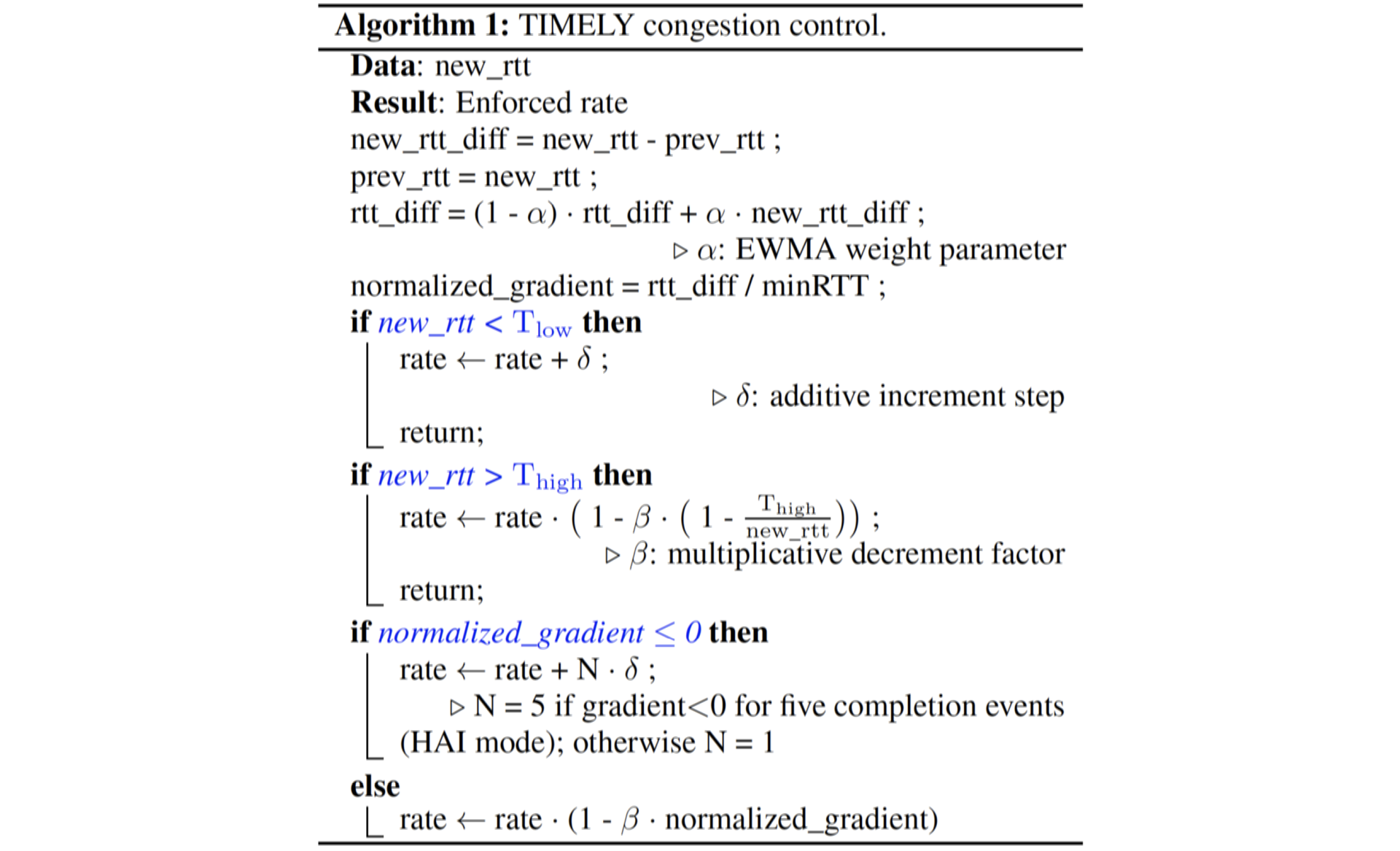 R. Mittal, V. Lam, N. Dukkipati, E. Blem, H. Wassel, M. Gohabdi, A. Vahdat, Y. Wang, D. Wetherall, D. Zats: “TIMELY: RTT-based Congestion Control for the Datacenter”, in: ACM SIGCOMM Computer Communication Review, Volume 45, Issue 4, August 2015.