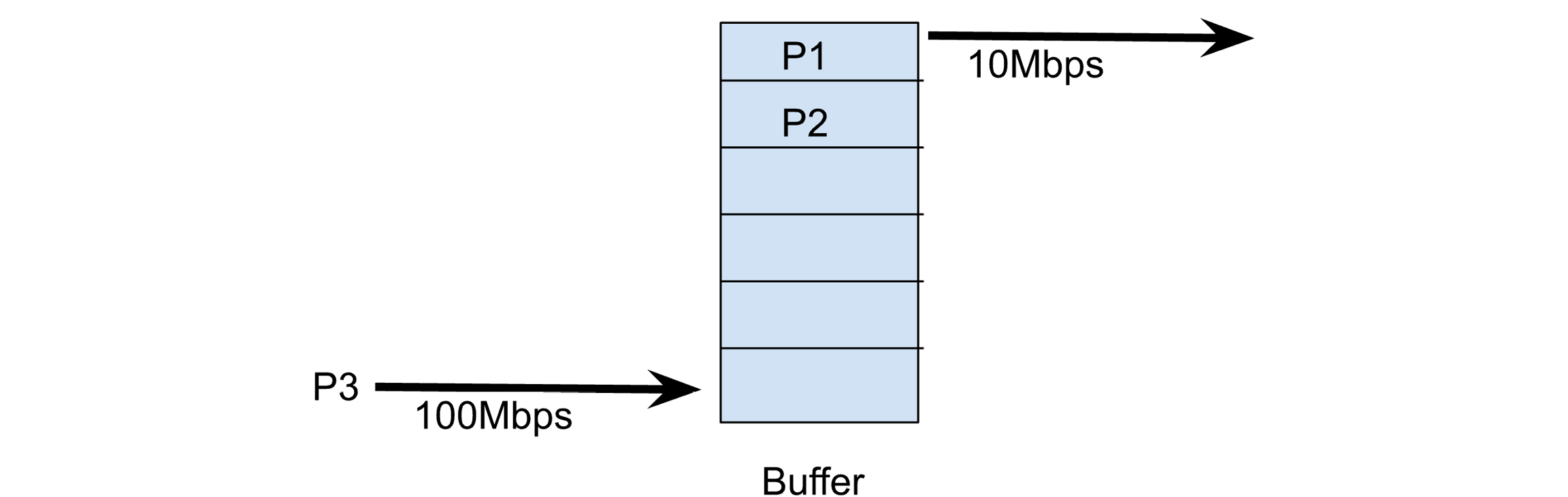 在这里,我们看到 P3 以 100Mbps 到达,它将被放入路由器缓冲区的第三个插槽。P1 当前正在传输到 10Mbps 的链路上,P2 正在等待传输。假设每个数据包大小为 1500 字节,P3 需要大约 120 微秒才能通过 100Mbps 的网络进行传输。当它轮到传送到 10Mbps 的目标网络时,它将需要 1200 微秒(即 120 微秒的 10 倍)。这意味着,路由器缓冲区中的每个数据包都会给刚到达的包增加 1200 微秒的额外延迟。