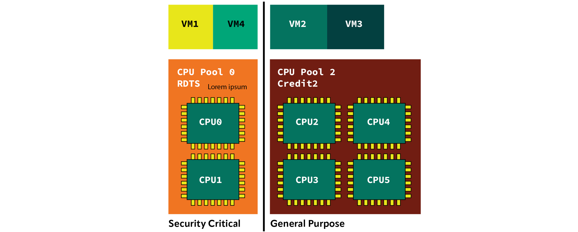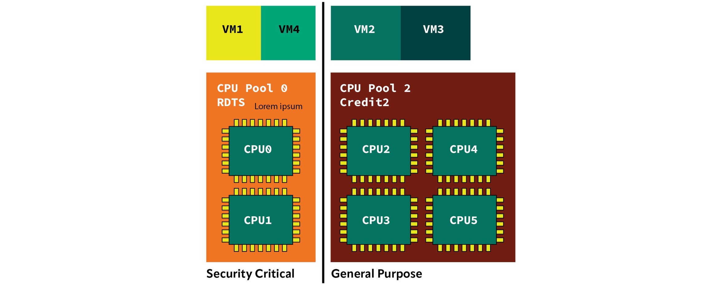 CPU 池:Xen 可以将 CPU 分区为不同的组,并为每个组分配不同的调度器。然后,可以将虚拟机分配到这些组,从而使一组虚拟机使用实时调度器(如 RTDS 或 ARINC653)运行,而另一组虚拟机则使用通用调度器(如 credit2)运行。请参见 CPU 池示意图。