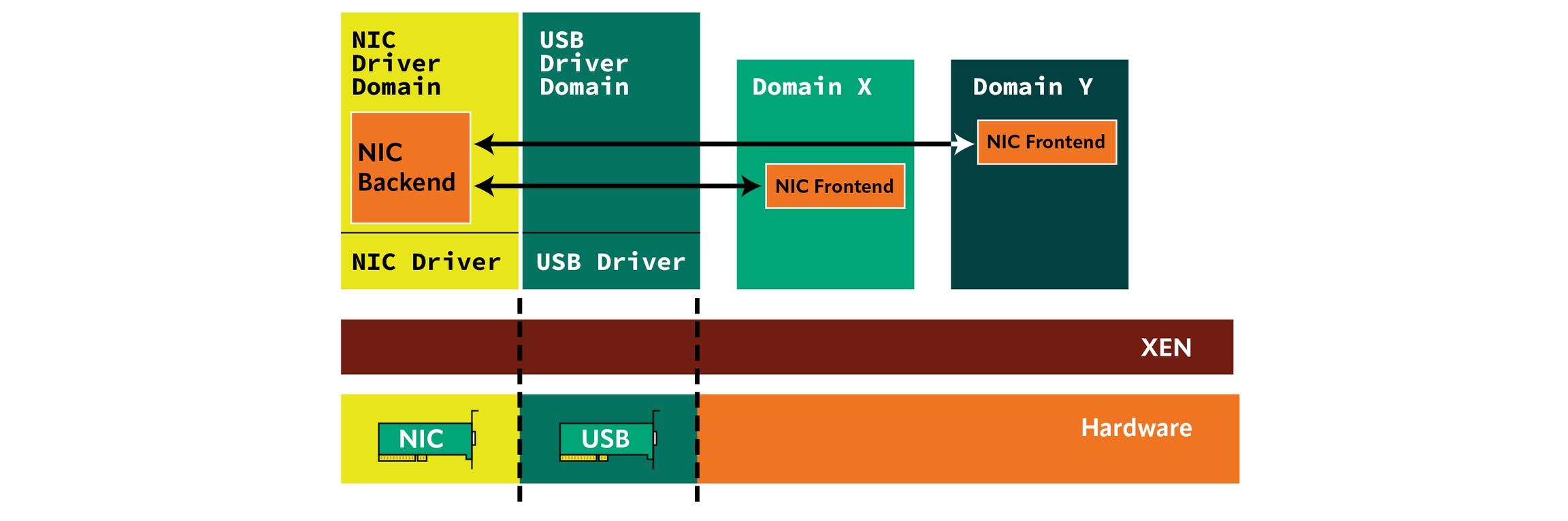驱动程序域:网络卡和 USB 驱动程序运行在单独的虚拟机中,从而避免了这些设备的安全问题危及整个系统。请参见关于驱动程序域的图示。