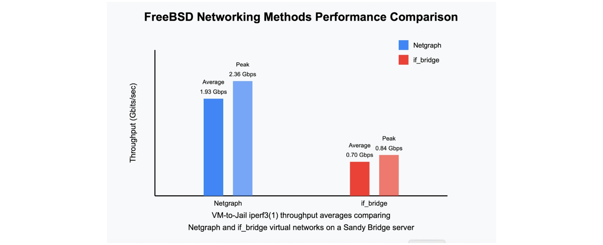 使用 Netgraph 有充分的理由。老实说,如果 if_bridge 始终可以跑得更快,我可能不会考虑它。但我在几个不同年代的服务器上,针对 FreeBSD 14.3 jail 和 bhyve VM 之间的网络通信做了一些简单的 iperf3 性能测试,对比了 if_bridge/tap/epair 与纯 Netgraph 通信方式。尽管测试不够科学严谨,Netgraph 无论在哪种硬件上都 consistently 表现更快。
